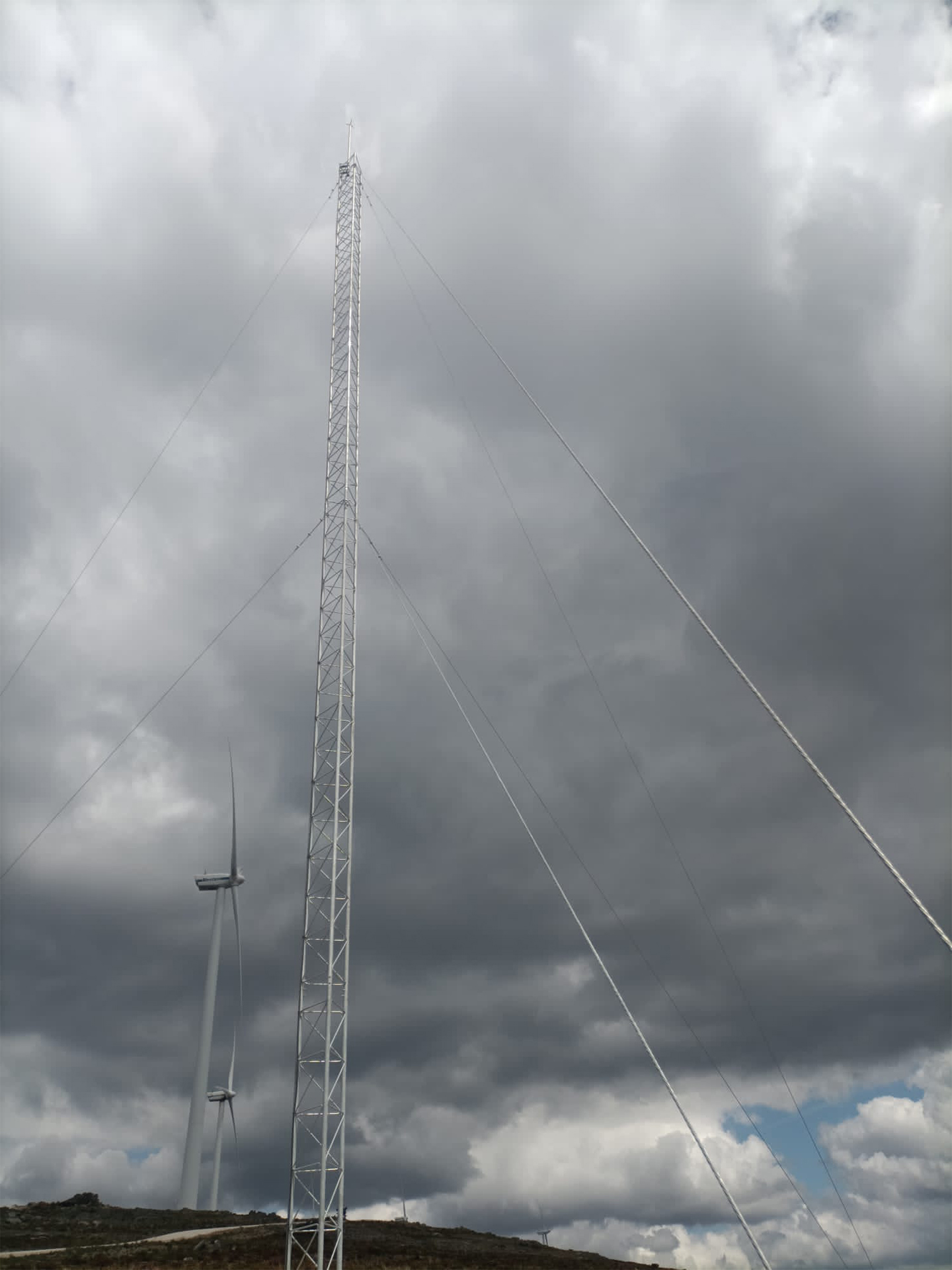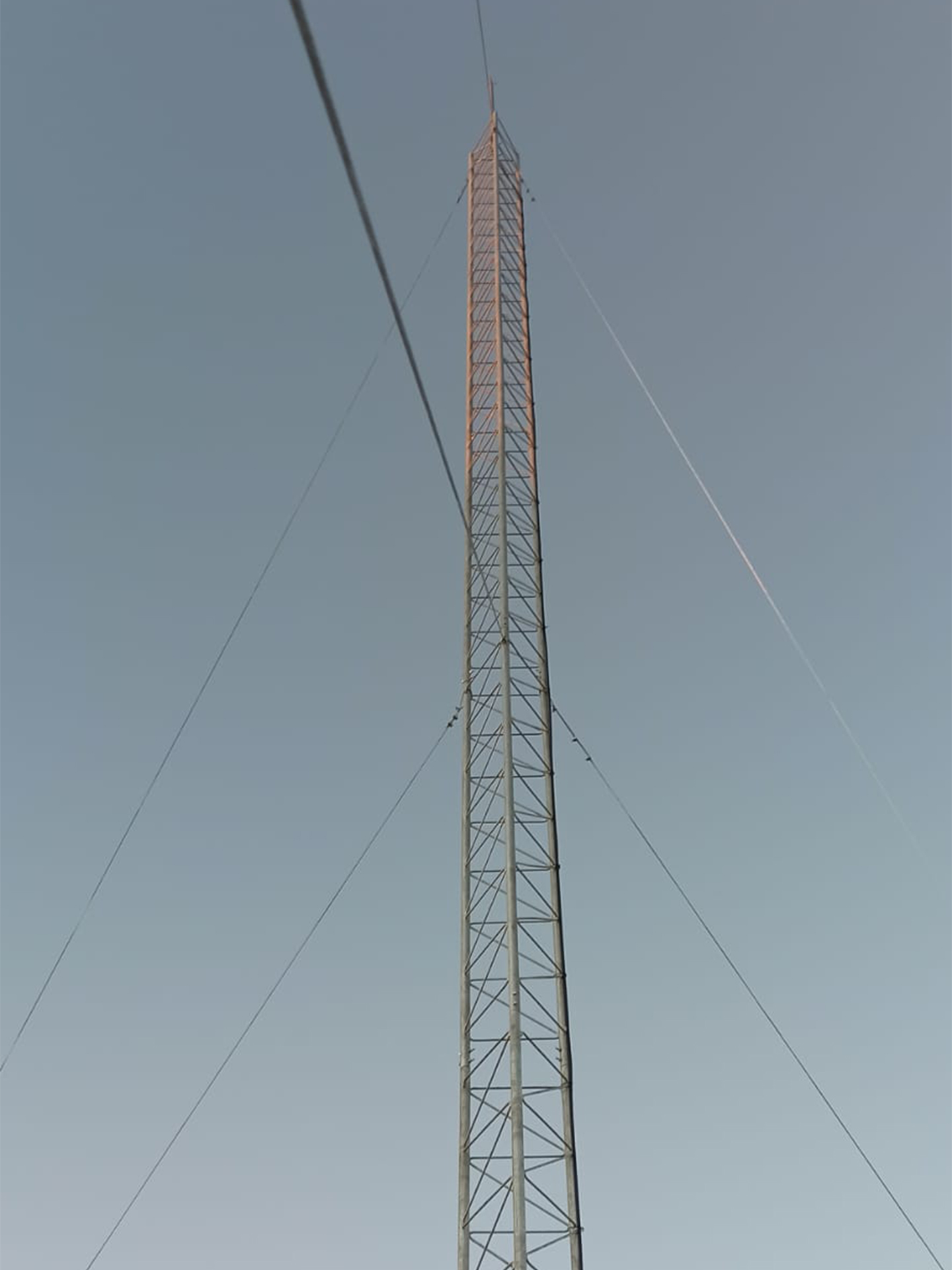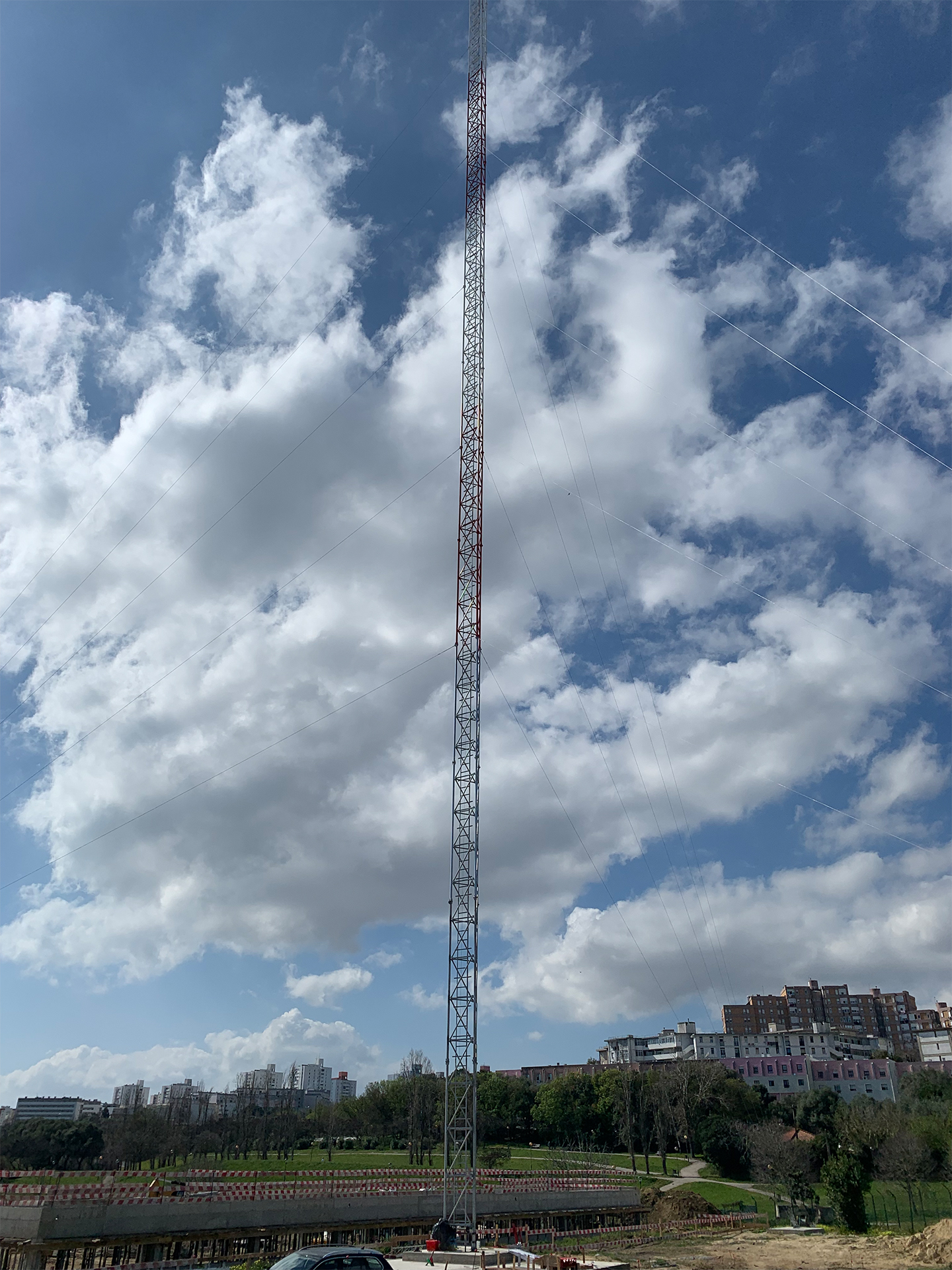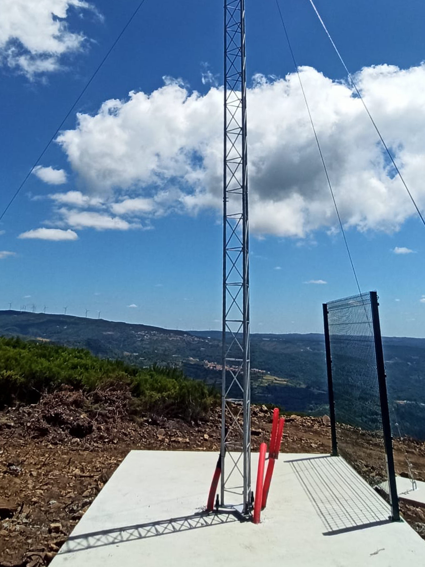 Relativamente à montagem da torre, esta é constituída por elementos de 3 metros e espiada de acordo com um estudo por nós efectuado, em cabos de aço de 6 mm ou 8 mm, consoante a altura da torre e as antenas nela aplicadas. A união dos elementos, é feita por aparafusamento em aço 8.8 zincado e o conjunto de espias será afinado por um sistema de esticadores, instalados no extremo de cada espia, colocada no maciço de espiamento.