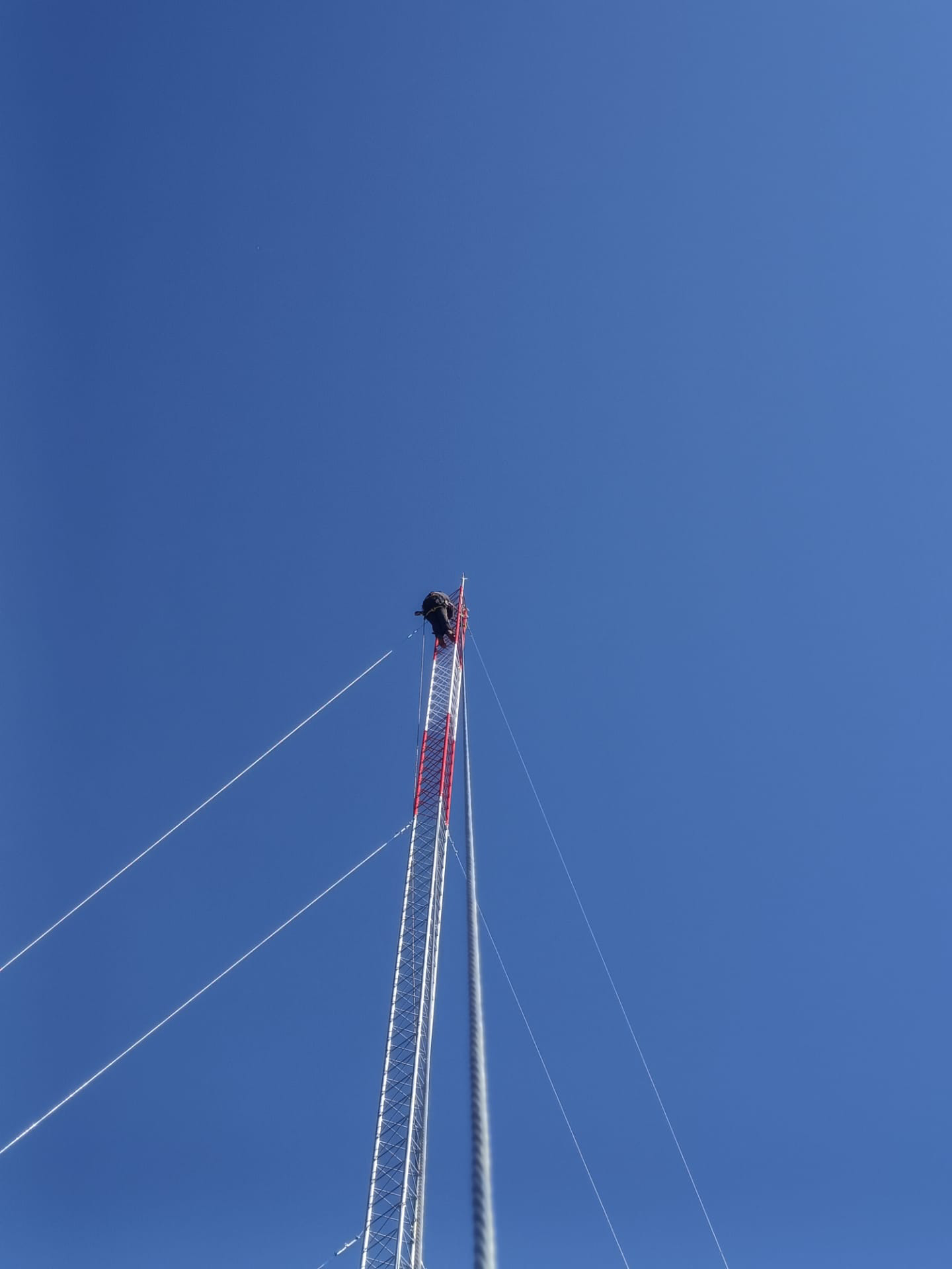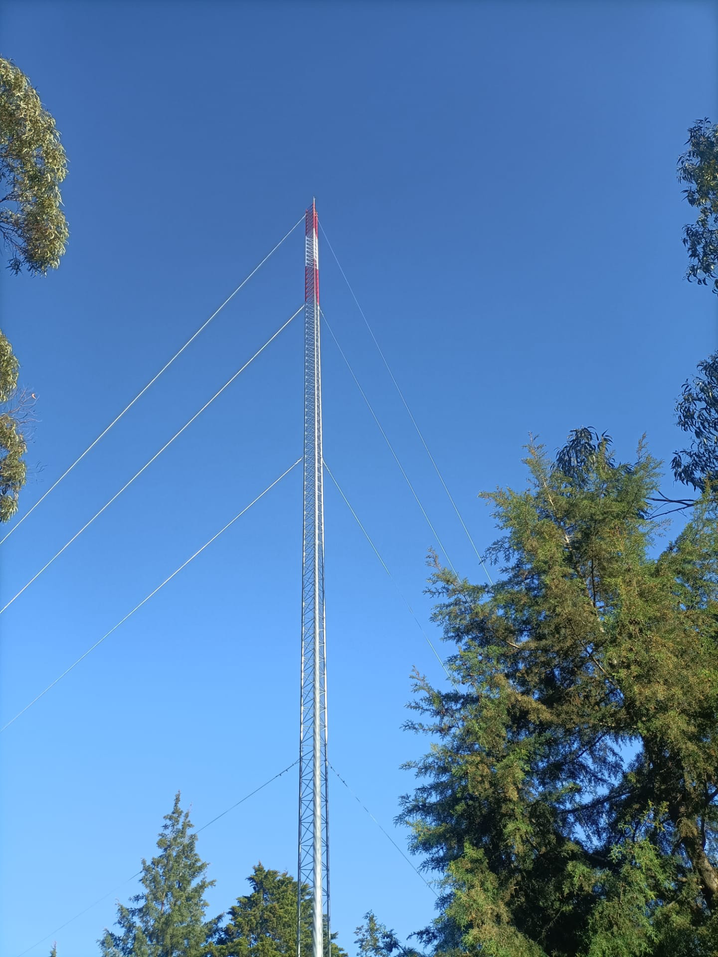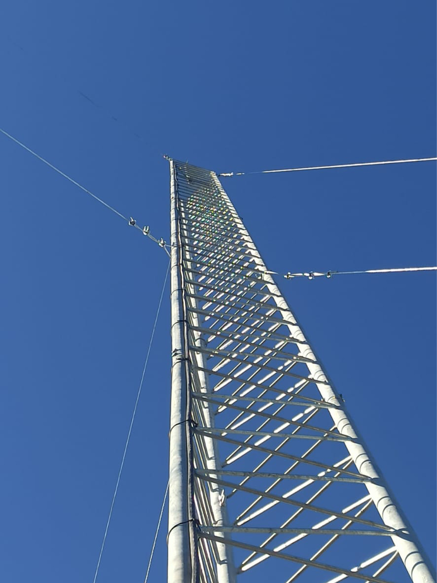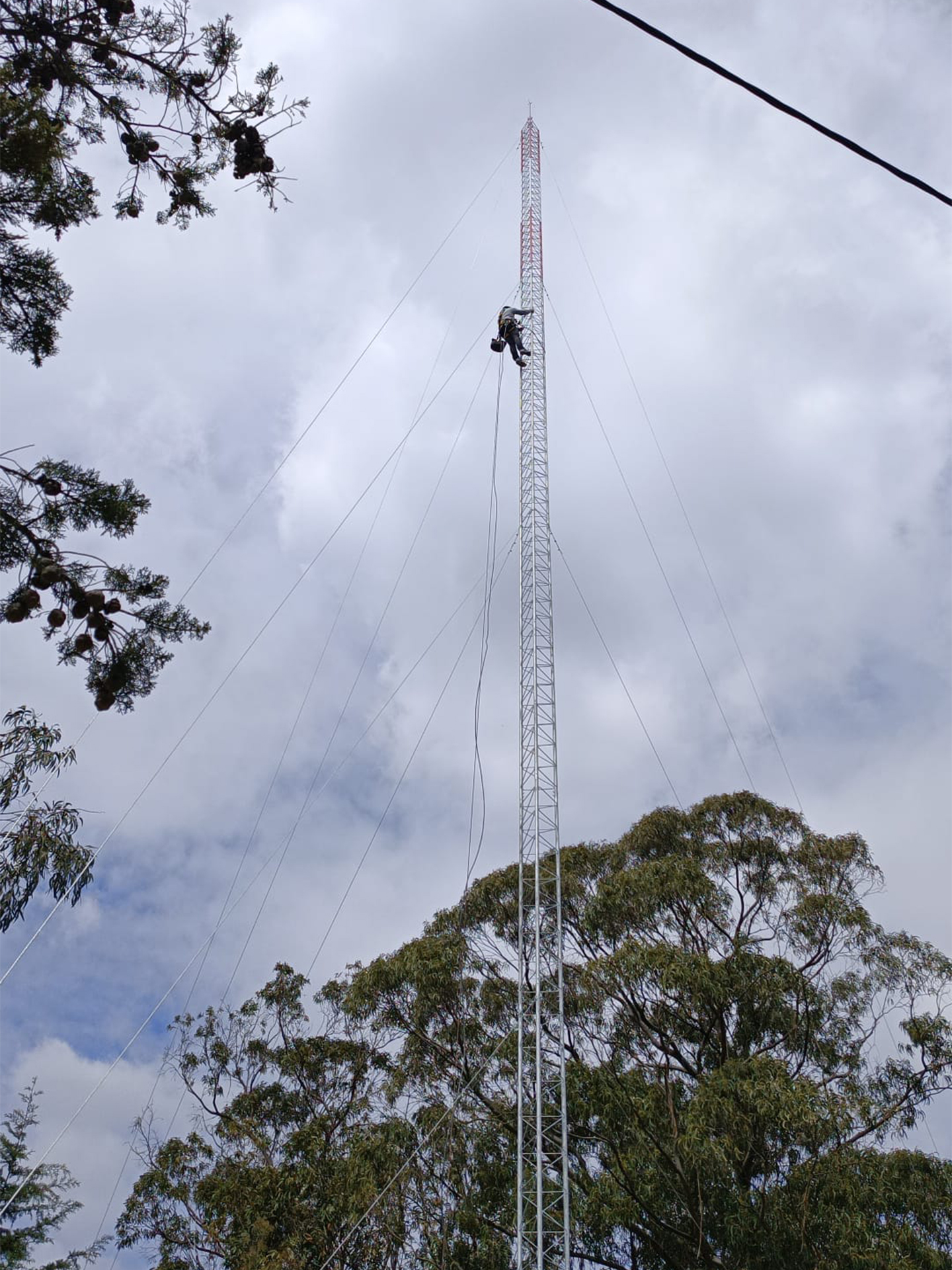 Relativamente à montagem da torre, esta é constituída por elementos de 3 metros e espiada de acordo com um estudo por nós efectuado, em cabos de aço de 6 mm ou 8 mm, consoante a altura da torre e as antenas nela aplicadas. A união dos elementos, é feita por aparafusamento em aço 8.8 zincado e o conjunto de espias será afinado por um sistema de esticadores, instalados no extremo de cada espia, colocada no maciço de espiamento.